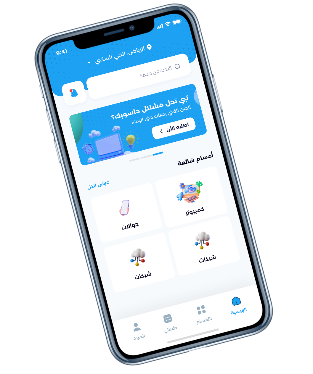 أول تطبيق يوفر للمستخدمين طلب الخدمات التقنية واختيار مقدم الخدمة المناسب، مع متابعة تنفيذها، والدفع عبر التطبيق.